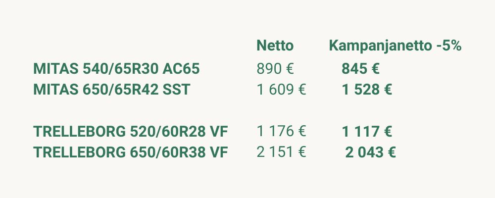 Hinnat alv 0 %, renkaita saatavana rajoitetusti. Tarjous voimassa 31.10.2025 asti. Hintoihin lisätään mahdolliset toimituskulut.
